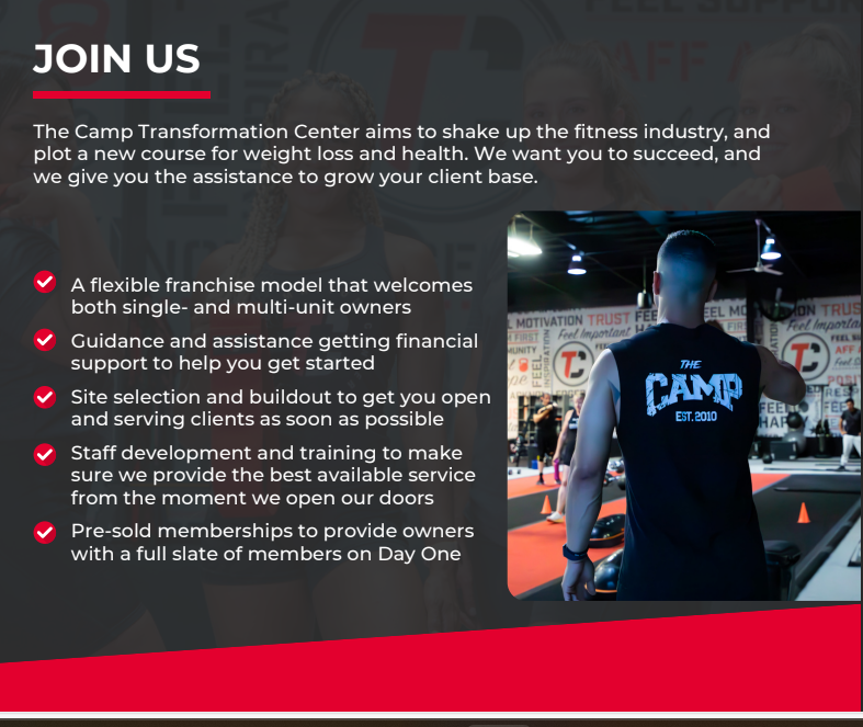 The Camp is growing rapidly, so, if you have a true passion for fitness, and you'd like to learn all the details about what sets us apart in this explosive market and how this opportunity could potentially transform your own life, fill out the form on this page and a representative will contact you shortly.